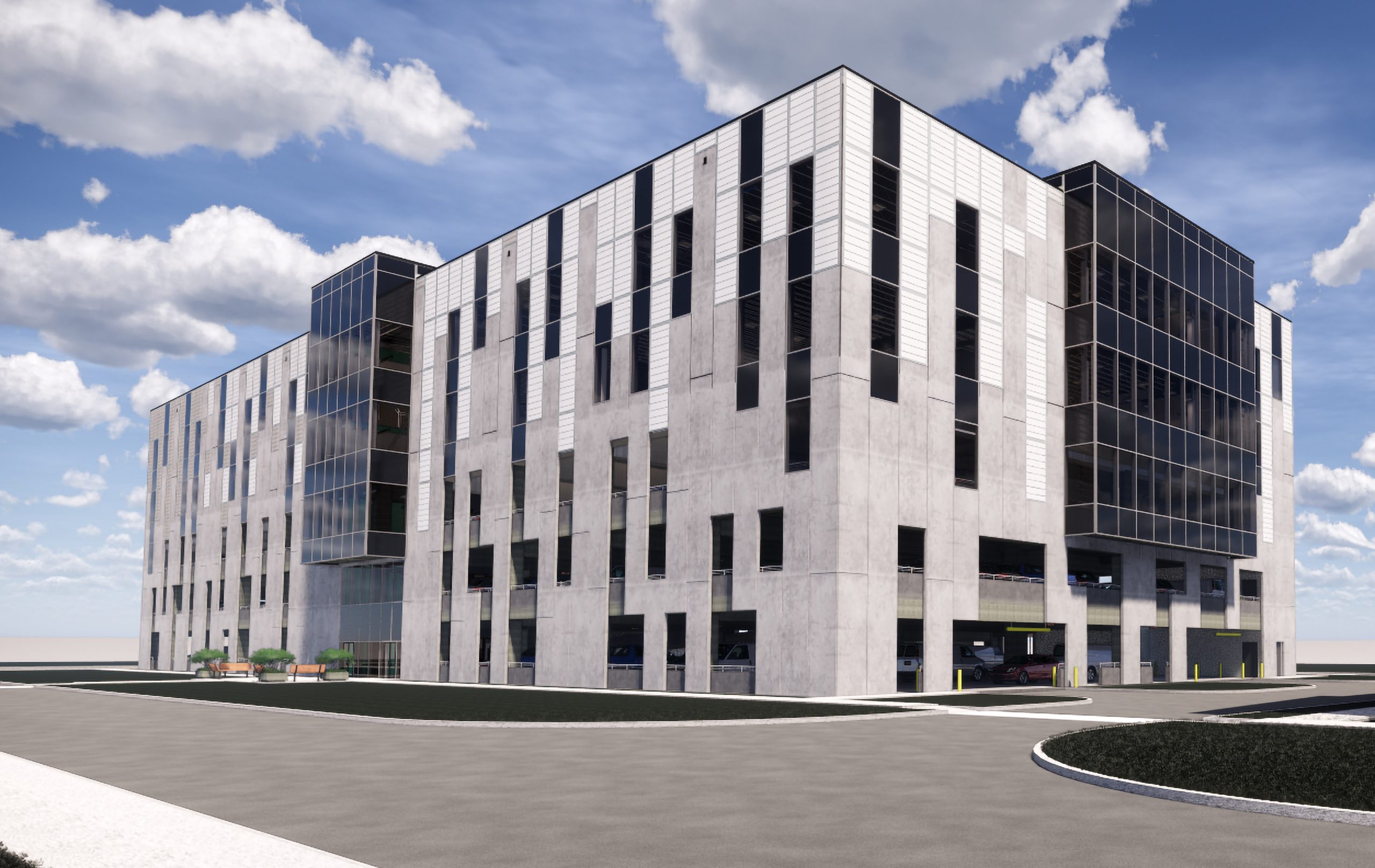 This blast resistant facility totaling approximately 175,000 square feet includes a three-level, 250-space parking garage with two stories of office space above the parking garage. The third level of parking garage is designed for the potential future conversion into office space. The building skin is designed in such a way that the office space and parking garage appear seamless, rather than two building types with striking contrast.
