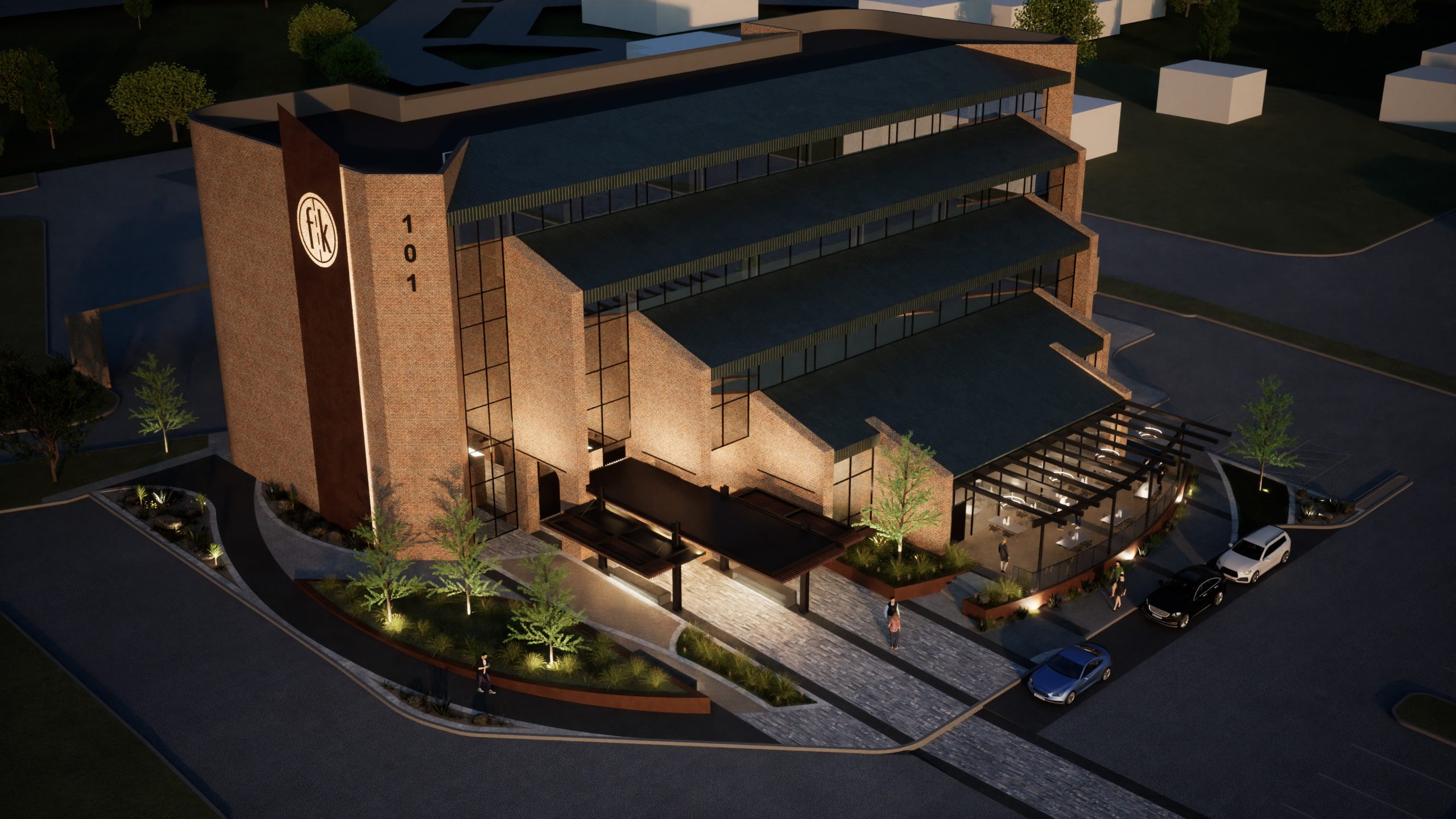 Located at the edge of White Settlement and Fort Worth, this renovation reimagines the potential corporate headquarters for Frank Kent Companies. The design introduces a more inviting and vibrant site experience, featuring expanded greenery, a generous entry plaza, and a covered walkway that enhances arrival and circulation. A bold blade sign anchors the building’s identity on the existing façade, while a new first-floor patio creates flexibility for a future restaurant tenant.