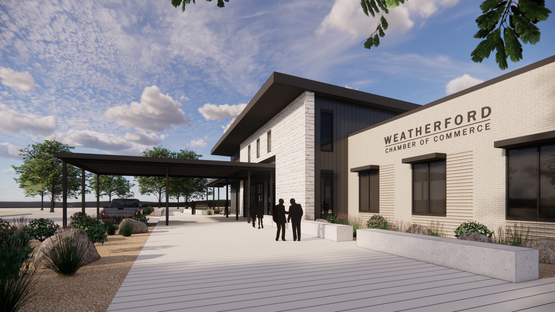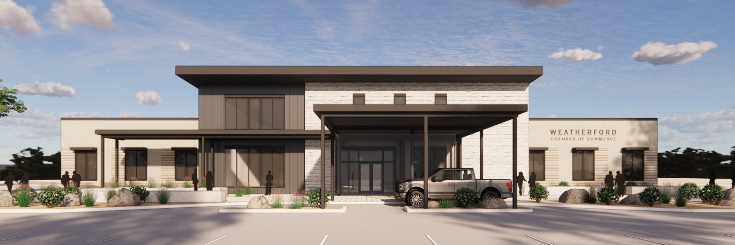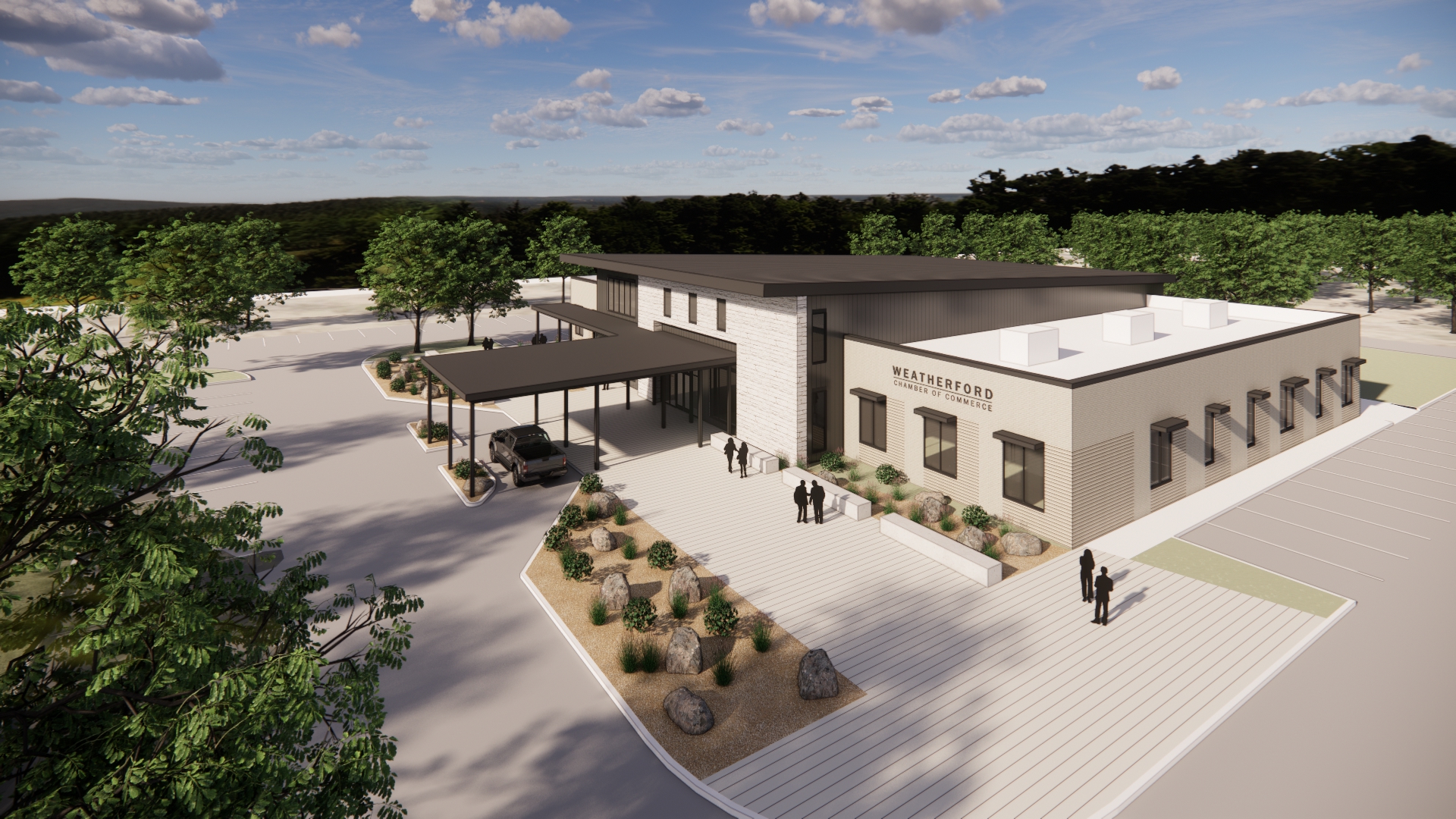 A new 18,000 square foot, one-story, facility for the Weatherford Chamber of Commerce featuring a new Office and Community Hall. The exterior design implements light colored stone and brick contrasting against a dark metal panel finish. The site design includes a porte-cochere for pick-up and drop-off, as well as an engaging entry plaza. Situated within the taller volume is a generously sized lobby with a stone fireplace and several small gathering areas as well as the Community Hall seating up to 450 people and will be served by an adjacent catering kitchen and table and chair storage for space configuration. The Community Hall is flanked by the Chamber Office Suite and a Community Business Center. The configuration of the facility within the site allows for future building and parking growth to the west. In the initial phase, this heavily-treed area will be utilized for outdoor events.