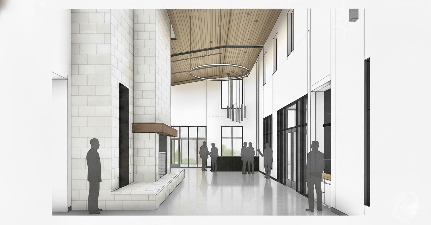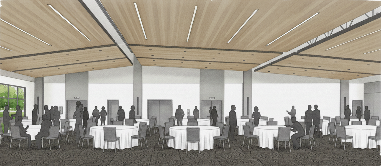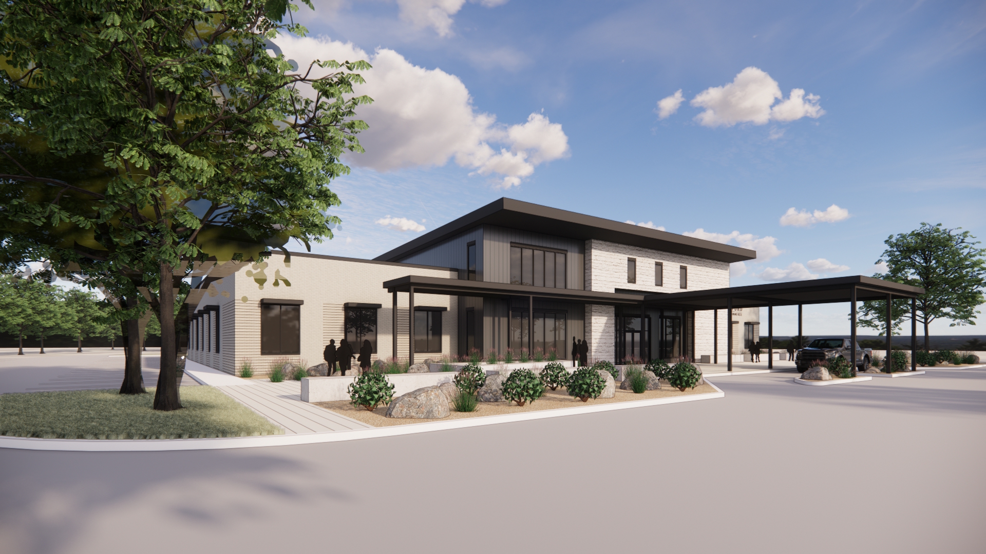 A new 18,000 square foot, one-story, facility for the Weatherford Chamber of Commerce featuring a new Office and Community Hall. The exterior design implements light colored stone and brick contrasting against a dark metal panel finish. The site design includes a porte-cochere for pick-up and drop-off, as well as an engaging entry plaza. Situated within the taller volume is a generously sized lobby with a stone fireplace and several small gathering areas as well as the Community Hall seating up to 450 people and will be served by an adjacent catering kitchen and table and chair storage for space configuration. The Community Hall is flanked by the Chamber Office Suite and a Community Business Center. The configuration of the facility within the site allows for future building and parking growth to the west. In the initial phase, this heavily-treed area will be utilized for outdoor events.